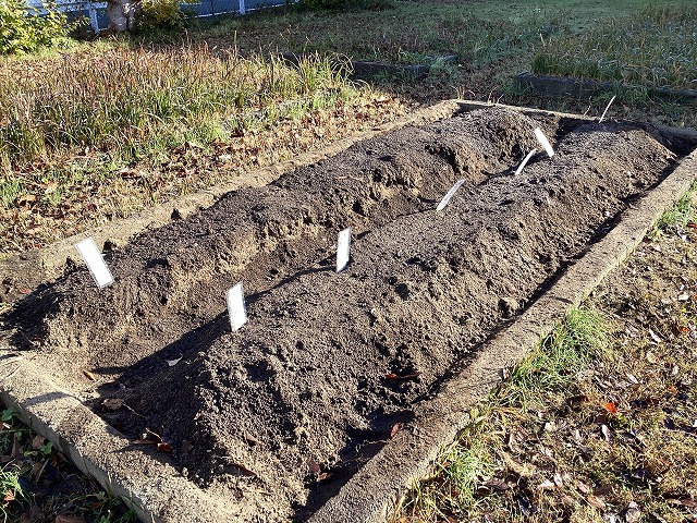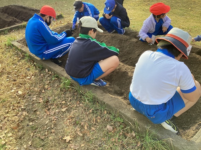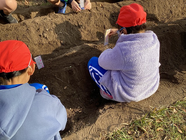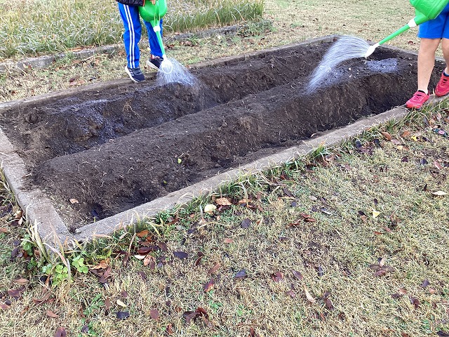 4組の子たちで、サツマイモを収穫した畑に肥料をまいて土を耕し、畝を作ったところにダイコンの種をまきました。大きなダイコンが育ちますようにと願いを込めて、思い思いにダイコンの名前を考え、ネームプレートに書きました。「ダイ子ちゃん」「だいきち」「ポチャコ」などのかわいい名前をつけました。みんなで協力して、水やりもがんばっています。寒さが増してくる中でも、元気に大きく育ってほしいなと思います。