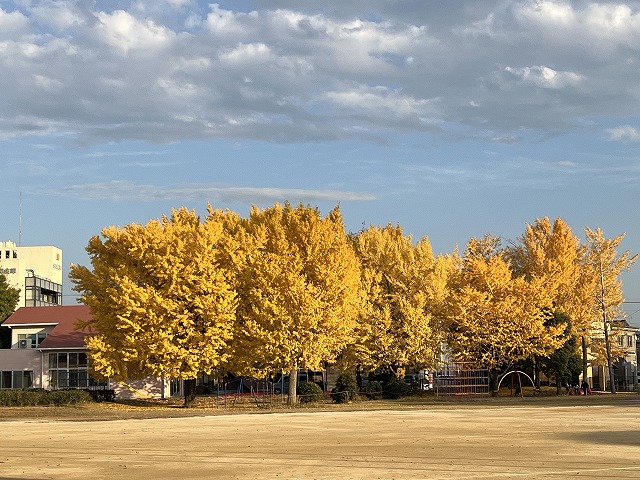 令和7年度1202 今が見頃の大銀杏 更新日:2025年12月02日 ページID : 26952 12月に入り、一気にイチョウが色づきました。イチョウの色づきを銀杏黄葉(いちょうもみじ)といいます。今年は例年以上にきれいに色づきました。 豊川市では、一宮の大和の大銀杏が有名ですが、桜木小の大銀杏も負けてはいません。 きれいに黄色く色づいたイチョウ。 かけ足練習はこの日が最終日でした。 この日が一番のピークの銀杏黄葉。