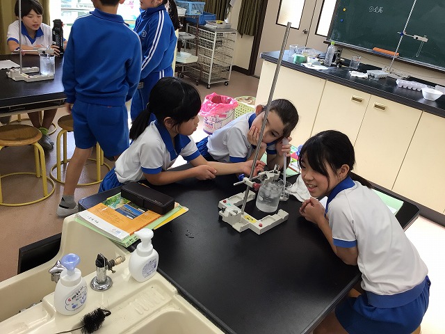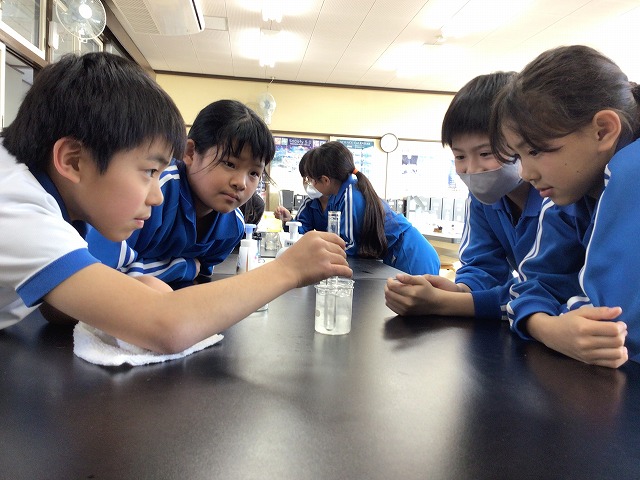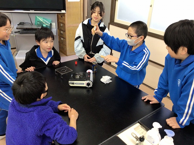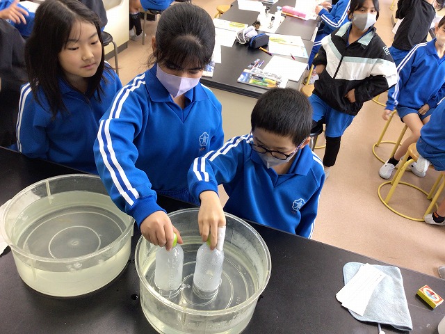 4年生の理科では「ものの温度と体積」の実験を行いました。空気・水・金属を温めたり冷やしたりして、体積がどのように変わるかを比べました。実験の結果、変化の大きさは「空気>水>金属」の順であることに気づくことができました。温度によってものは目に見えないところで大きさが変わっていることを、実験を通して実感している様子でした。