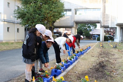 12月に入り、1年生がこれまでアサガオを育てていた鉢に、パンジーとチューリップを植えました。このパンジーとチューリップは、卒業式で使います。