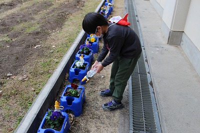 「きれいな花を咲かせてね」そんな願いを込めて、毎日1年生の子たちは水やりをしています。