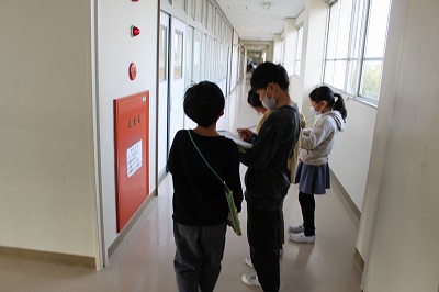 3年生では、今、社会科「まちを守る人々」の授業の一環で、消防の仕事について学んでいます。その授業の一環で、学校内の消防設備に何があるのか、どこにあるのかを調査しました。消火器、消火栓、避難ばしご、いろいろな設備が整えられていることがわかりました。
