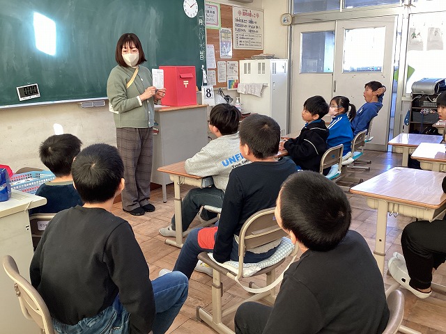 2月中旬ごろに4組の子どもたちが校内で行う、「にこにこ郵便局」の準備が始まりました。にこにこ郵便局で交換した葉書を使って、全校の子どもたちが、友達やペア学年の子、先生たちに手紙を書きます。そして、校内のポストに投函された葉書を、4組の子どもたちが配達する活動です。