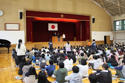 表彰披露では、善行児童表彰や持久走大会の表彰など、たくさんの表彰が行われ、表彰されたどこの子にも、全校の児童から温かい拍手がされました。