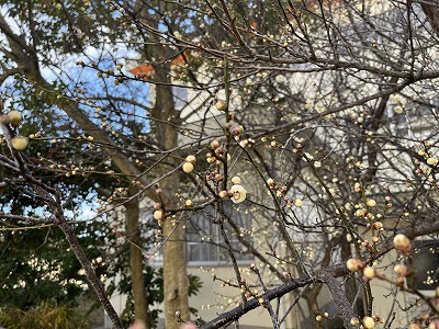 令和7年度0113 梅の開花 更新日:2026年01月13日 ページID : 27531 1月に入り、寒い日が続いています。しかし、南校舎と北校舎の間の白梅の木が、花を咲かせ始めています。梅が咲きだすと、もうすぐ春がやってくることを実感します。 遠目からはまだ気づきにくいですが 近くによるとたくさんの花が咲いています