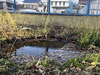 湧き水を汲みだしている池は、水温が高いため湯気がうっすらと。