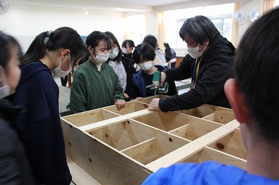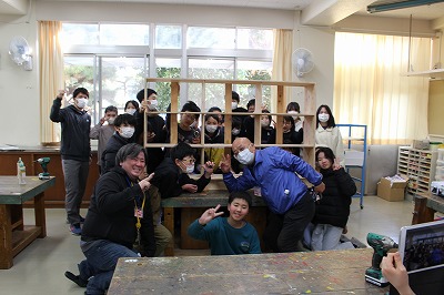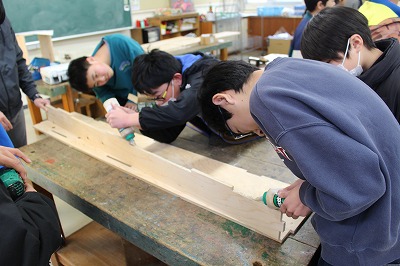 学年みんなで組み立て、ねじをとめ、ボンドで補強してできあがりです。よい卒業制作ができました。