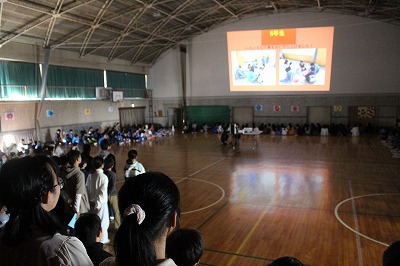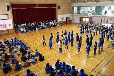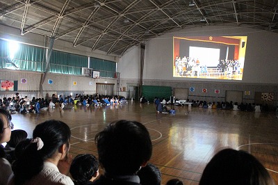 最初は6年生に向けて、各学年の感謝の発表が行われました。そして、そのあとは、思い出ムービー。自分たちの小さなころの写真が出てきて、6年生の子からは感嘆の声が聞かれました。最後は、この会を行ってくれた6年生からの感謝の発表、そして全学年みんなで校歌を歌いました。花道を出ていく6年生からは、「ありがとう」という声がたくさん聞かれました。