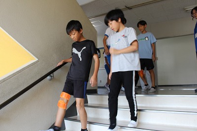 足にコルセットを巻いて関節が動きにくい体験もしました。