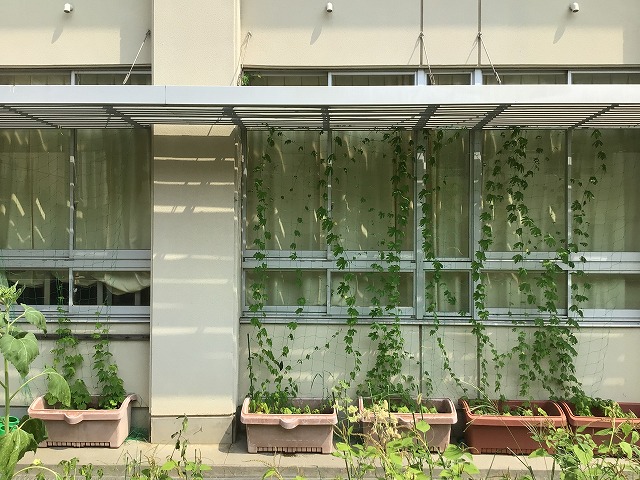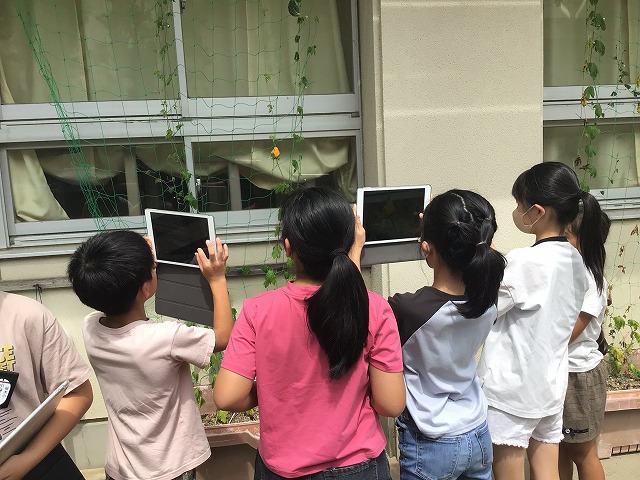 4年生で1学期に植えたツルレイシが、ぐんぐん伸びて実をつけました。緑の実に加えて、熟して黄色になったものも見られました。「おお~!」とびっくりしている声が聞こえてきました。