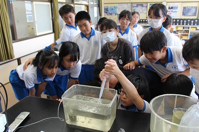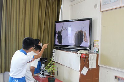 6年生理科「生物と地球環境」の単元の食物連鎖の一環として、微生物のミジンコの観察をしました。