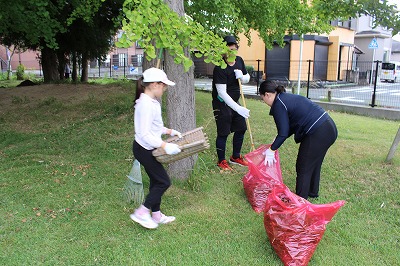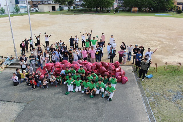 この日はたくさんの保護者の方だけではなく、地域の野球チーム「フレンズ」の方や「桜木おやじの会」などを合わせて100人を超える方にご参加いただきました。集まったごみは赤い袋で実に200袋に及びました。