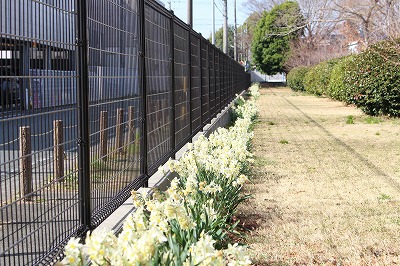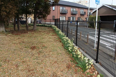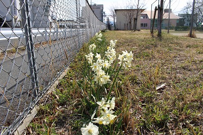 3月に入り、校地の外周に植えてあるスイセンが満開になっています。このスイセンは、地域の方が何年もかけて少しずつ植えてくださったものです。