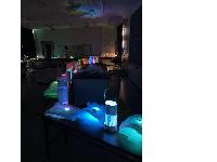 先週、6年生が図工で制作した作品をLED照明で彩ったものが理科室に展示されました。暗幕を使って昼間でも暗室にしての展示でした。写真を観ていただいてもわかるかと思いますが、本当にほんのりした灯りに照らし出される作品たちの素敵さは言葉を失うほどのものでした。こうした理科室の演出も含めて職員からも驚きの声が聞こえました。素敵な空間の出現となりました。